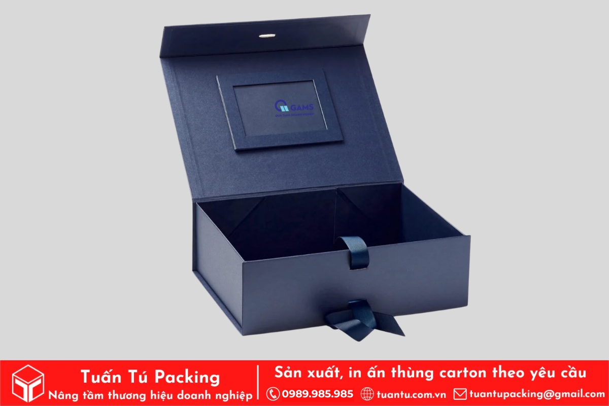 - Hộp nắp hít nam châm: Kiểu hộp mở bằng nam châm gắn ở mép nắp, mang lại cảm giác sang trọng, hiện đại. Khi chọn loại này, cần đảm bảo nam châm có lực hút đủ mạnh để hộp không bị bung trong quá trình vận chuyển.