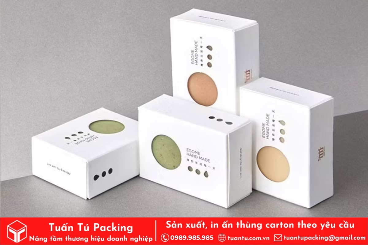 • Hộp cửa sổ (khoét lỗ): Có ô cửa trong suốt ở mặt trước hoặc mặt hông hộp, giúp khách nhìn thấy sản phẩm thật. Đây là cách hiệu quả để tăng độ tin cậy và thu hút sự chú ý.