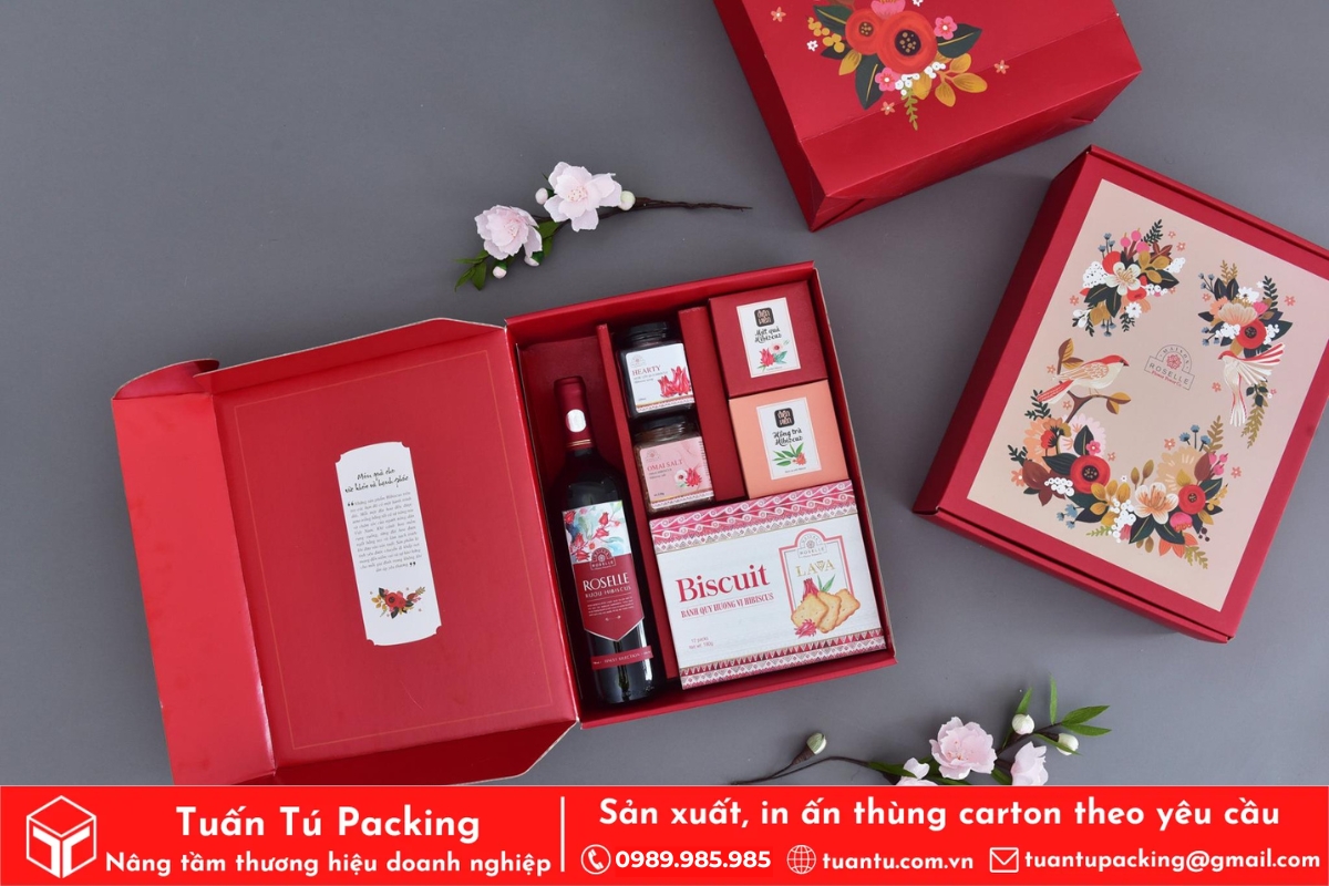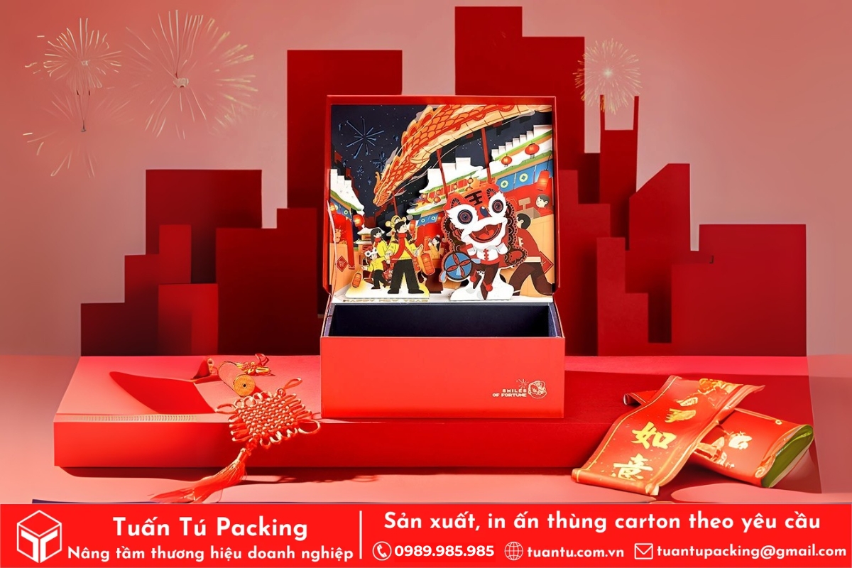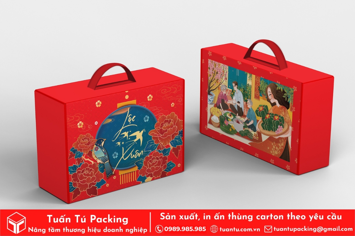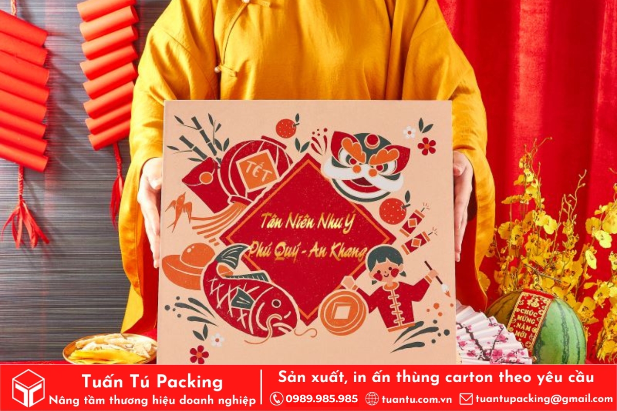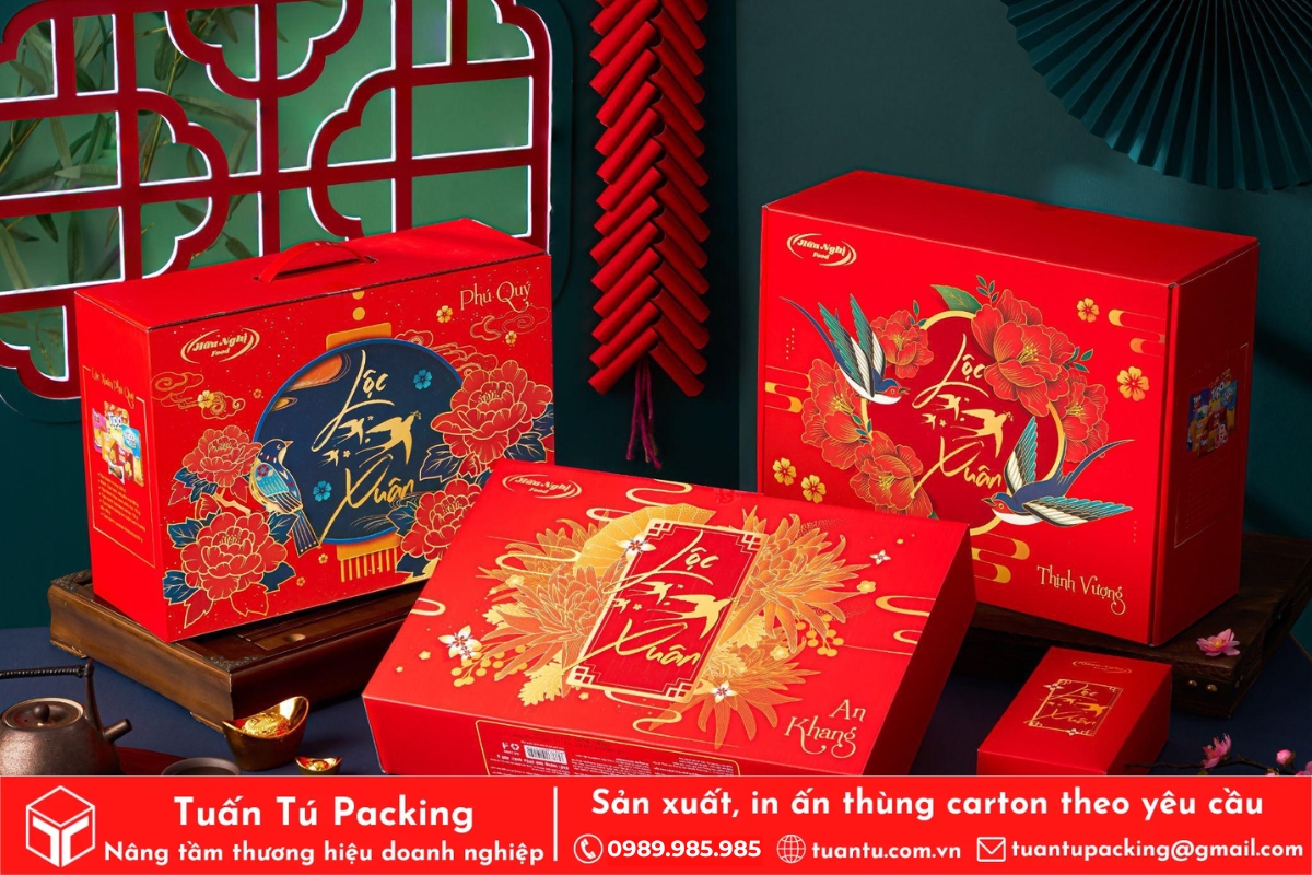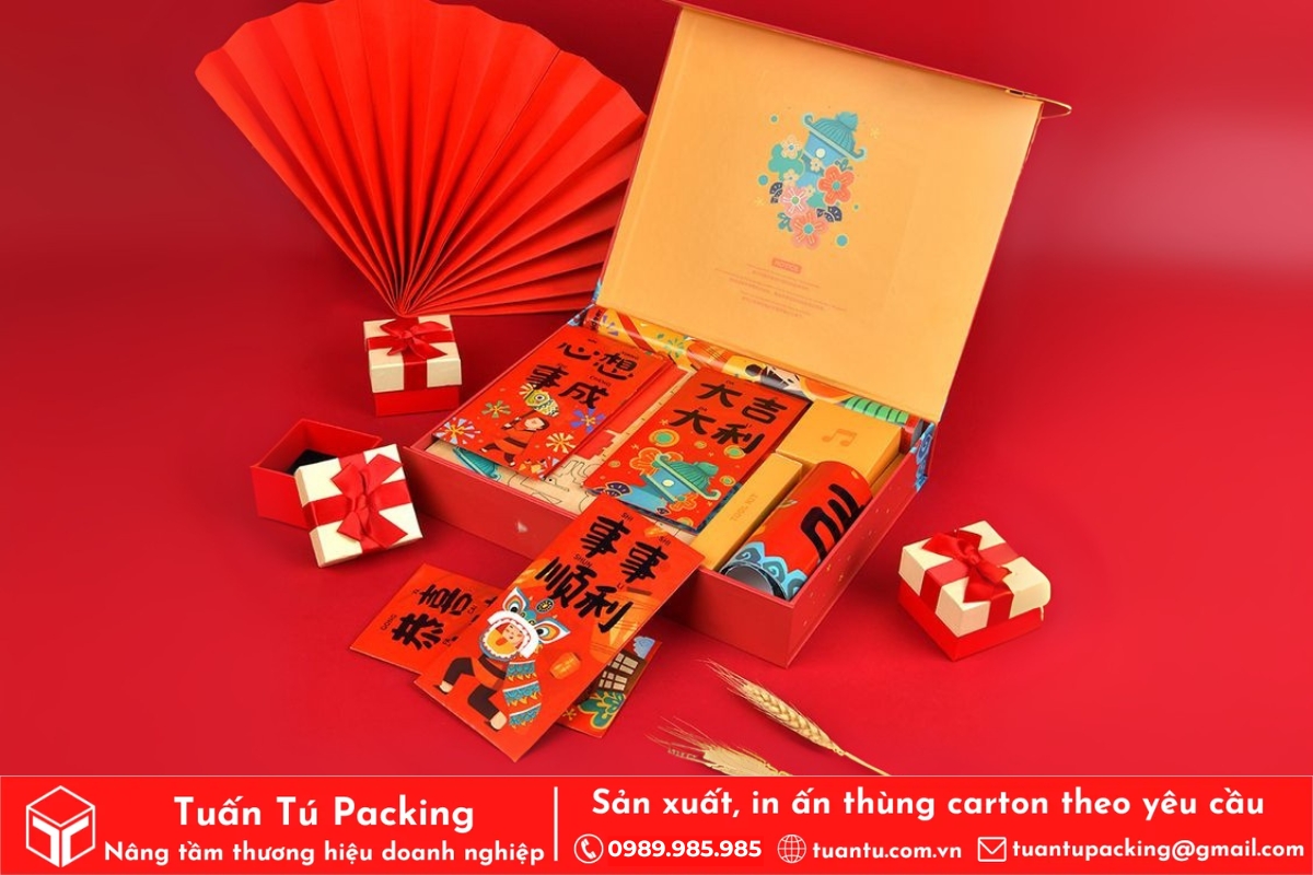 In hộp quà Tết là phương tiện hữu hiệu để truyền tải trọn vẹn tình cảm và những lời chúc tốt đẹp nhất đến người nhận. Hộp quà được thiết kế với họa tiết truyền thống, sắc đỏ may mắn sẽ giúp lan tỏa không khí Tết và thông điệp thịnh vượng, may mắn. Việc cá nhân hóa trên bao bì còn thể hiện sự chu đáo, chân thành, giúp gắn kết mối quan hệ giữa doanh nghiệp với đối tác và nhân viên.