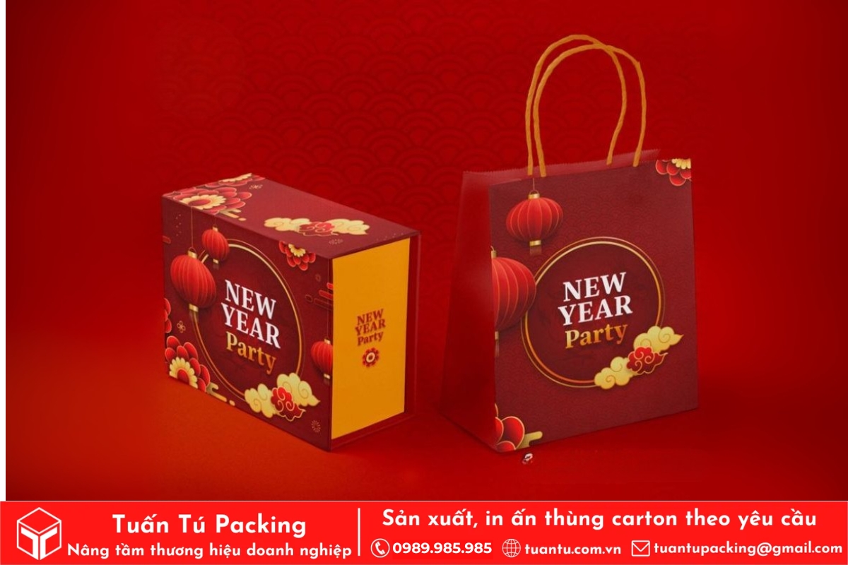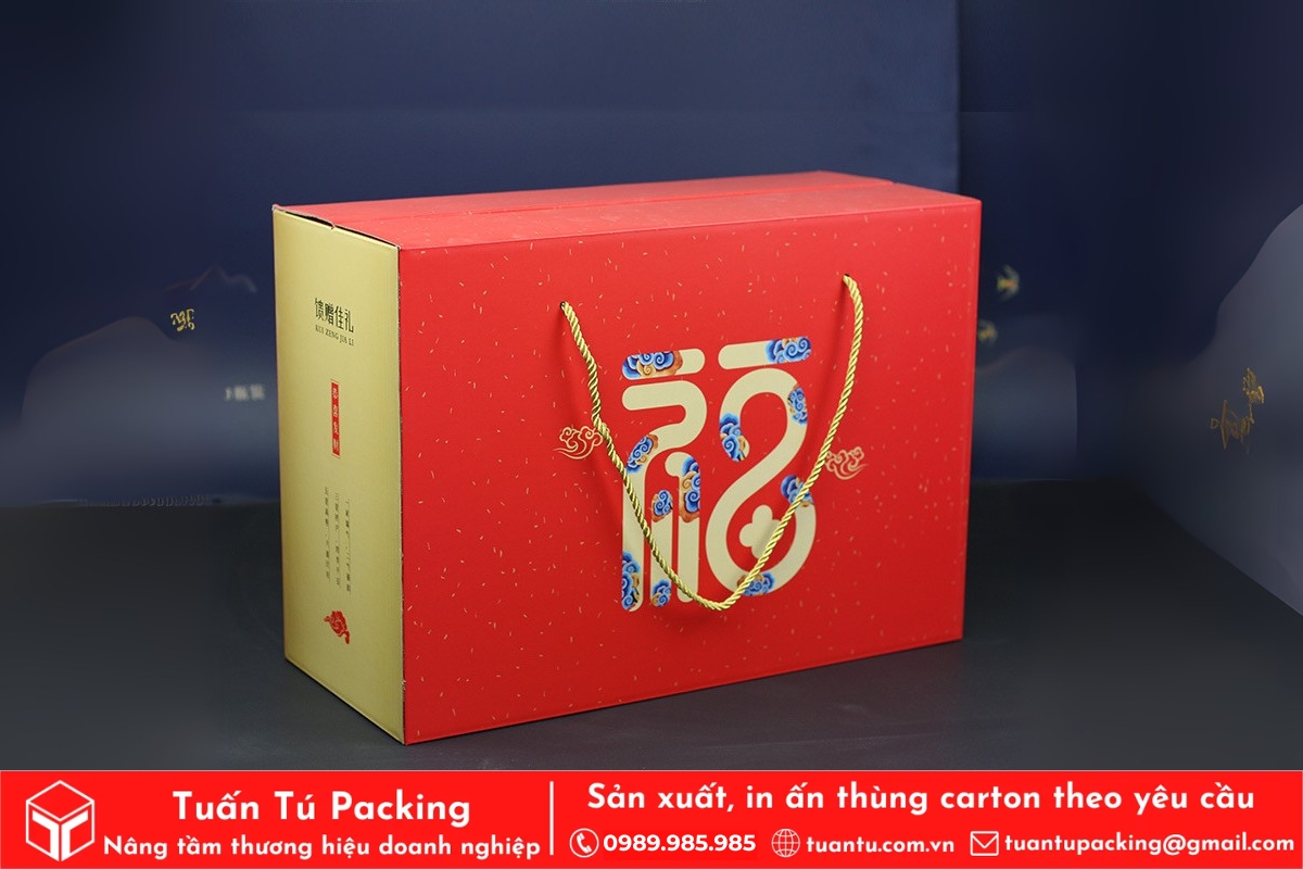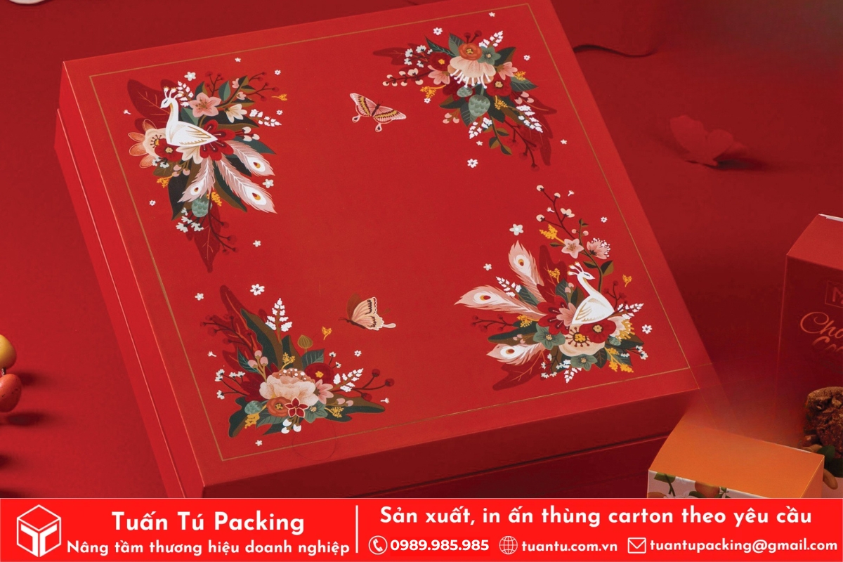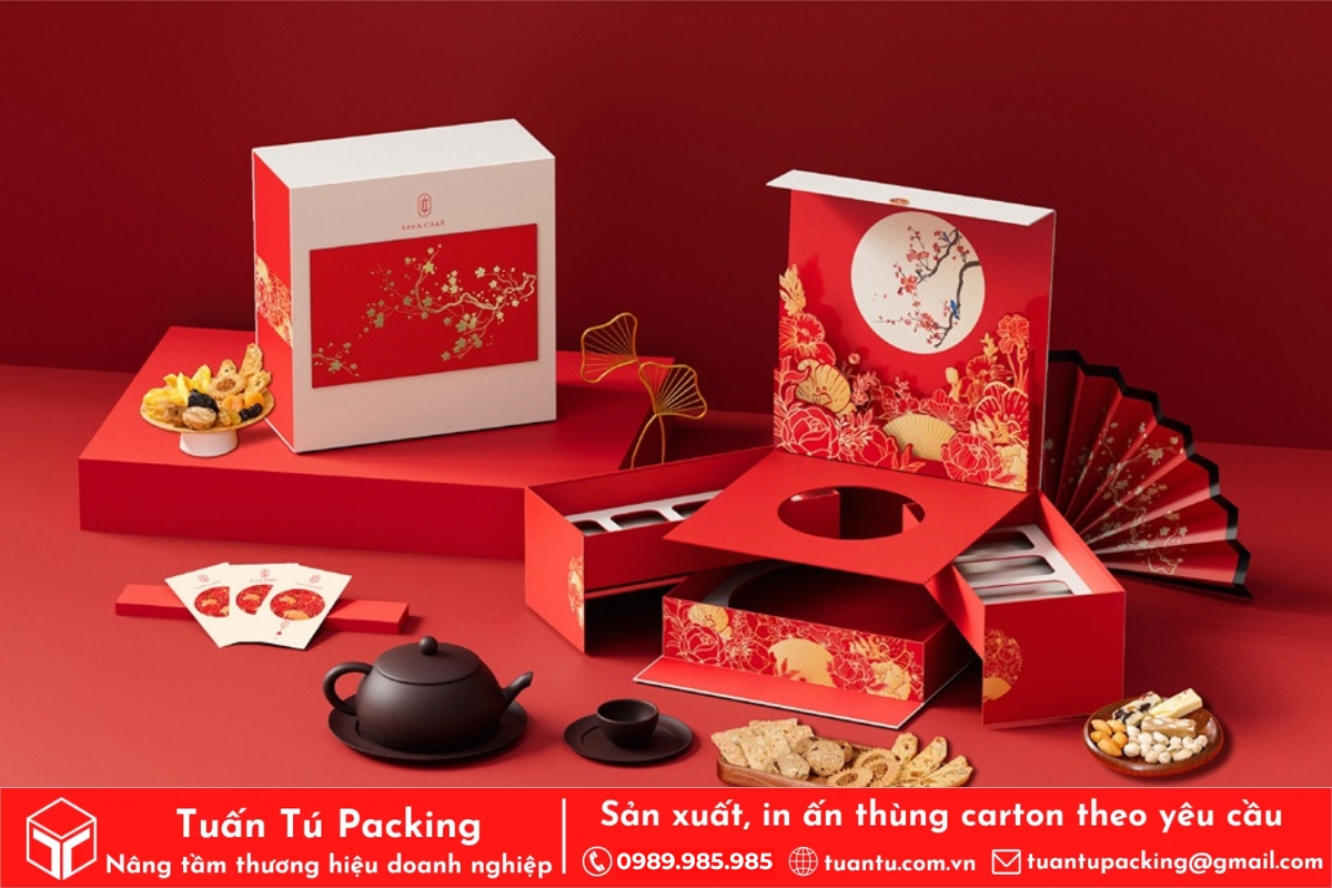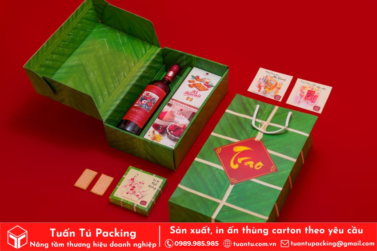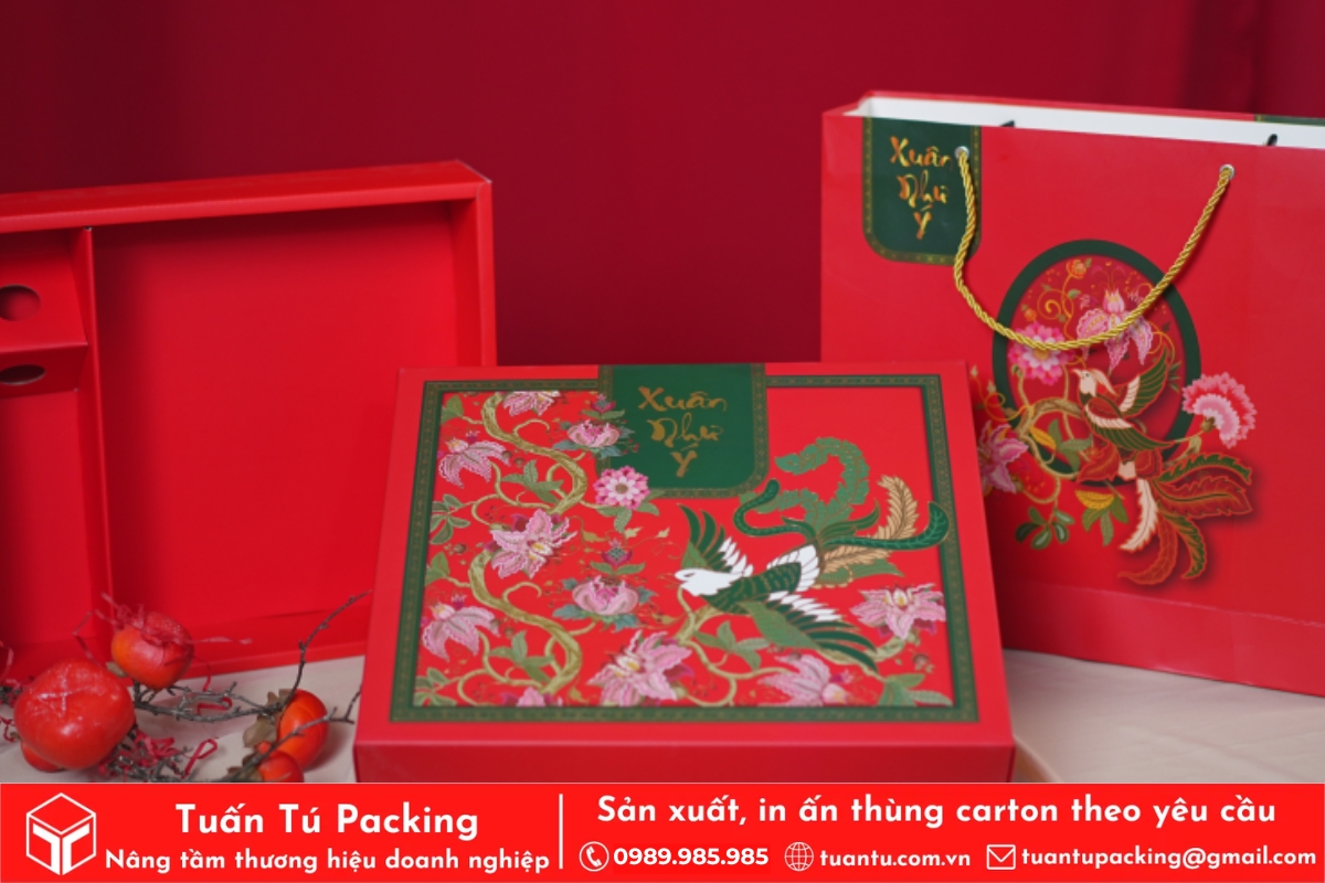 In hộp quà Tết là phương tiện hữu hiệu để truyền tải trọn vẹn tình cảm và những lời chúc tốt đẹp nhất đến người nhận. Hộp quà được thiết kế với họa tiết truyền thống, sắc đỏ may mắn sẽ giúp lan tỏa không khí Tết và thông điệp thịnh vượng, may mắn. Việc cá nhân hóa trên bao bì còn thể hiện sự chu đáo, chân thành, giúp gắn kết mối quan hệ giữa doanh nghiệp với đối tác và nhân viên.