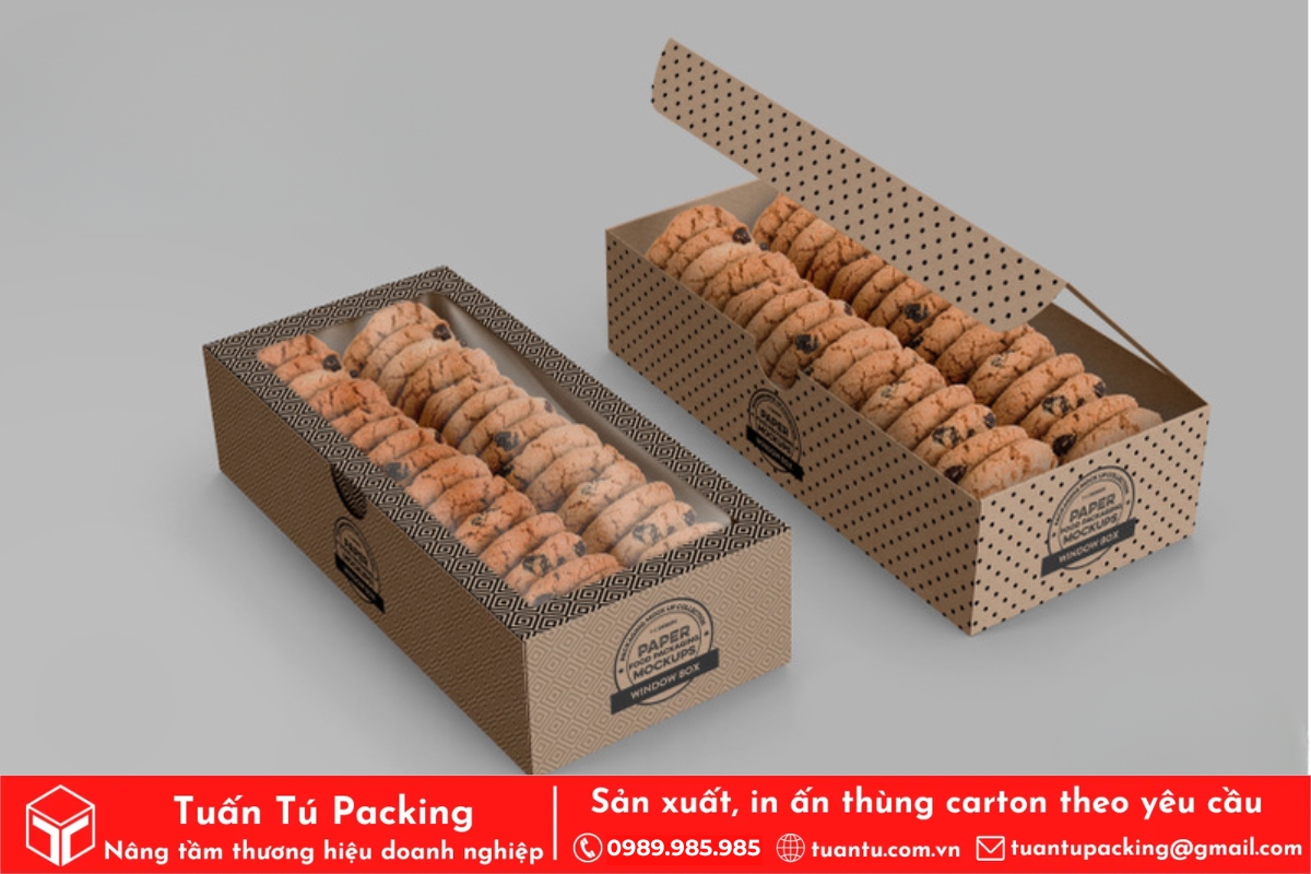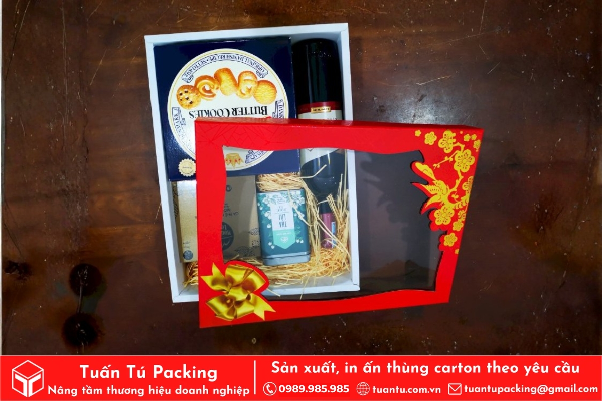 Hộp giấy đựng quà Tết có cửa sổ là mẫu thiết kế thông minh, cho phép người nhận chiêm ngưỡng sản phẩm bên trong mà không cần mở hộp. Phần cửa sổ được làm bằng chất liệu mica hoặc nhựa trong suốt, giúp trưng bày vẻ đẹp của sản phẩm bên trong một cách trực quan và hấp dẫn. Mẫu hộp này tăng cường tính tương tác, làm nổi bật chất lượng sản phẩm, đồng thời vẫn đảm bảo tính bảo vệ của bao bì.