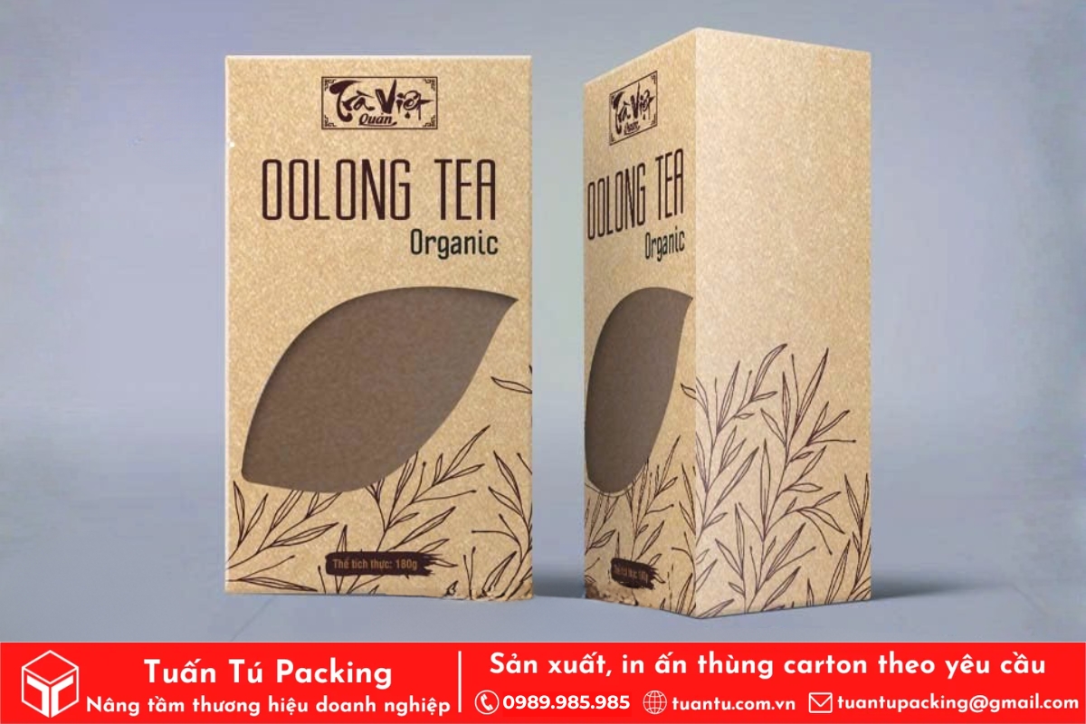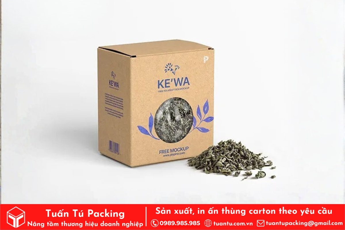 - Hộp cửa sổ mica/decal: Hộp có ô cửa sổ trong suốt, giúp khách hàng nhìn thấy sản phẩm trà bên trong, tăng tính trực quan.