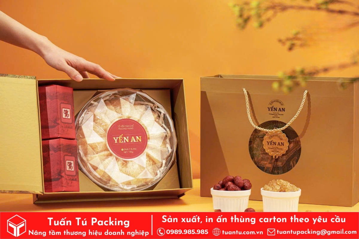 • Túi giấy: Không chỉ tiện lợi và lịch sự trong việc mang hộp yến, mà còn là công cụ quảng bá khi được in logo, tên doanh nghiệp, góp phần tăng độ nhận diện thương hiệu.