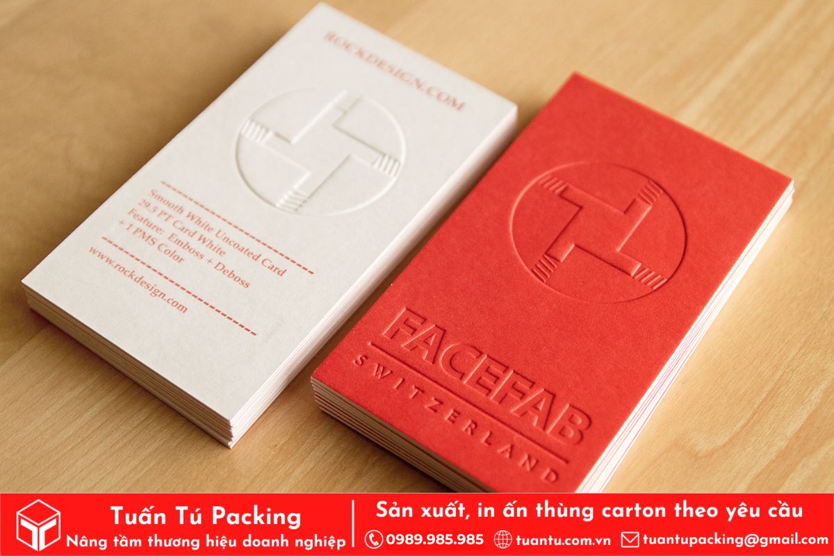 - Dập nổi: Quá trình này tạo ra các chi tiết nhô cao lên khỏi bề mặt vật liệu, mang lại hiệu ứng nổi bật, sang trọng và thu hút. Dập nổi thường được sử dụng để làm nổi bật logo, hình ảnh hoặc các chi tiết quan trọng trên sản phẩm, tạo cảm giác đẳng cấp và ấn tượng. Đây là kỹ thuật phổ biến cho các sản phẩm cao cấp như danh thiếp, bao bì mỹ phẩm, thiệp mời.